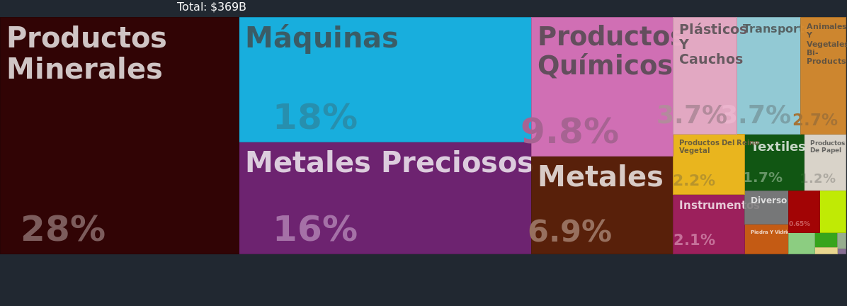 Las manufacturas son muy importantes para las exportaciones totales de India, representando el 63.55% en 2023. Esto resalta su gran contribución a la economía del país y a la competitividad en el comercio global.